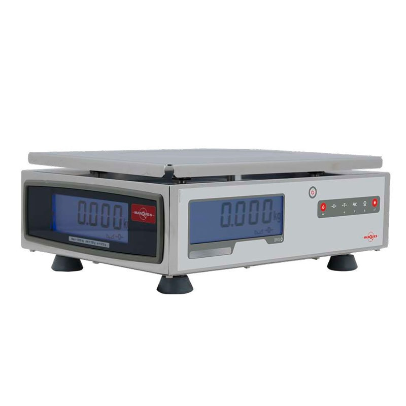 La Serie BMX0 Modelo Check-Out es una balanza electrónica de alta funcionalidad diseñada para comercios que necesitan precisión y rapidez. Esta balanza cuenta con un visualizador de peso LCD con 6 dígitos de siete segmentos y un segundo visualizador en el lado del cliente. Incluye un teclado multifunción de 7 teclas que proporciona una variedad de funciones, como Peso-Tara y Cuenta piezas. También ofrece la posibilidad de fijación de tara y destare automático. Además, cuenta con 2 puertos serie RS 232 bidireccionales, opción de conexión a repetidor de peso, múltiples protocolos de comunicación, formatos pre-configurados de ticket y etiquetas, y una construcción en acero inoxidable con un plato de dimensiones 335x245 mm.