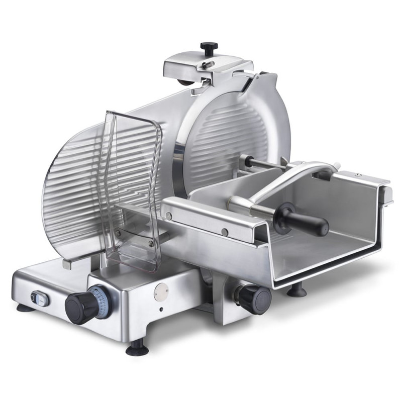 Cortadora integrada de acero inoxidable 18/8, cortdora de gran capacidad con movimiento automático del carro, transmisión sin fin corona, cubre-cuchilla con dispositivo de seguridad, cuchilla protegida por aro, posibilidad de trabajo como carro manual, cuchilla alimana G+B, afilador incorporado de carro: 32 lonchas / minuto, espesor de corte: 0-25mm