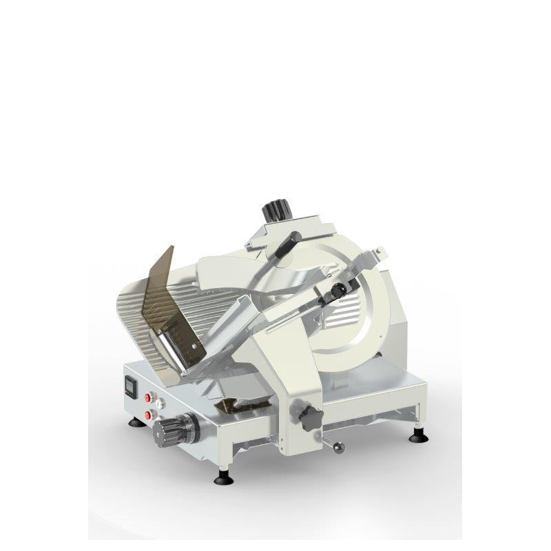 Cuchilla protegida por aro, cu-cuchilla con dispositivo de seguridad, sistema eléctrico baja tensión 24v, transmisión sin fin corona, índice de protección IP65, cortadora integrada de acero inoxidable 18/8, cuchilla alemana G+B, afilador incorporado automático, espesor de corte: 0-25mm.