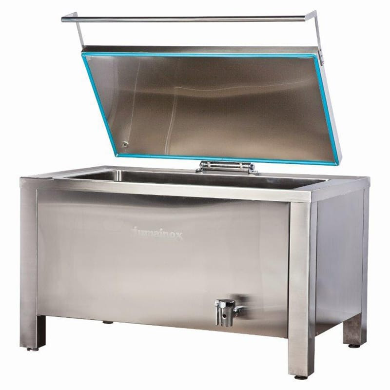 Rebozadora-empanadora automática de nivel industrial, ideal para producciones medias, con velocidad ajustable y sistema de soplado para exceso de líquido.