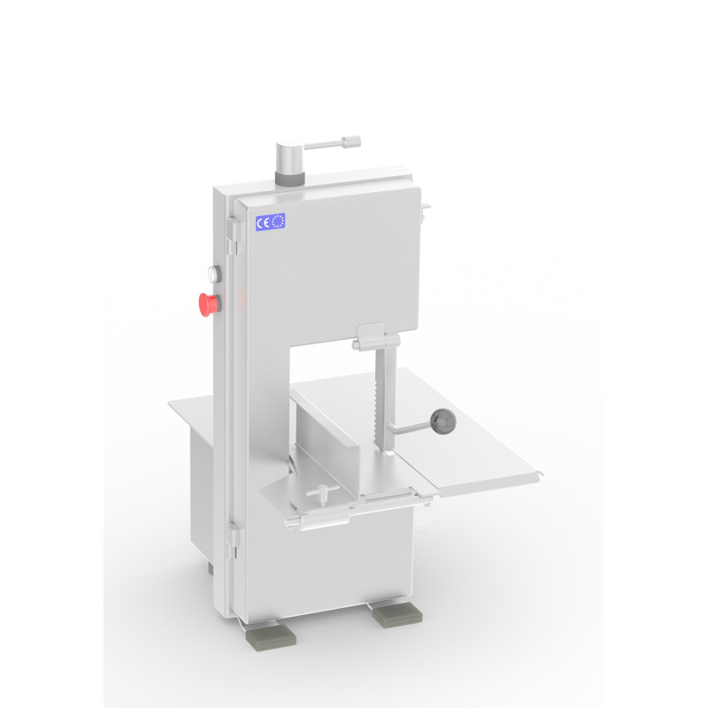 Sierra de carne integrada Inox 18/10, poleas de acero inoxidable con doble pestaña, tensado de cinta de proceso automático, dispositivo de parada de cinta en 4 segundos, pulsadores de marcha-paro seta de emergencia IP65, dispositivo de seguridad en apertura puerta, no puesta en marcha involuntaria máquina, limpiadores desmontables sin herramienta, para su fácil limpieza, fácil limpieza con agua a presión, fabricación corte mano derecha y mano izquierda.